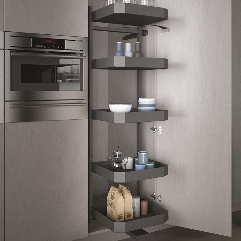 Korkean kaapin mekanismi M600-runkoon. Liukukiskot ja hyllyt tilattava erikseen. Suositeltava sarana vähintään 120 ° aukeava hidastinsarana. Mekanismi voidaan asentaa sekä vasen- että oikeakätisenä.