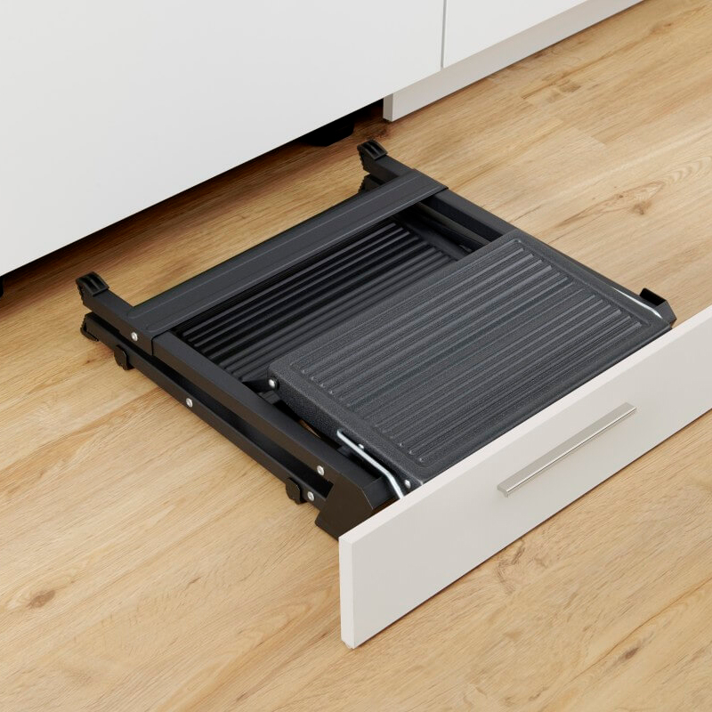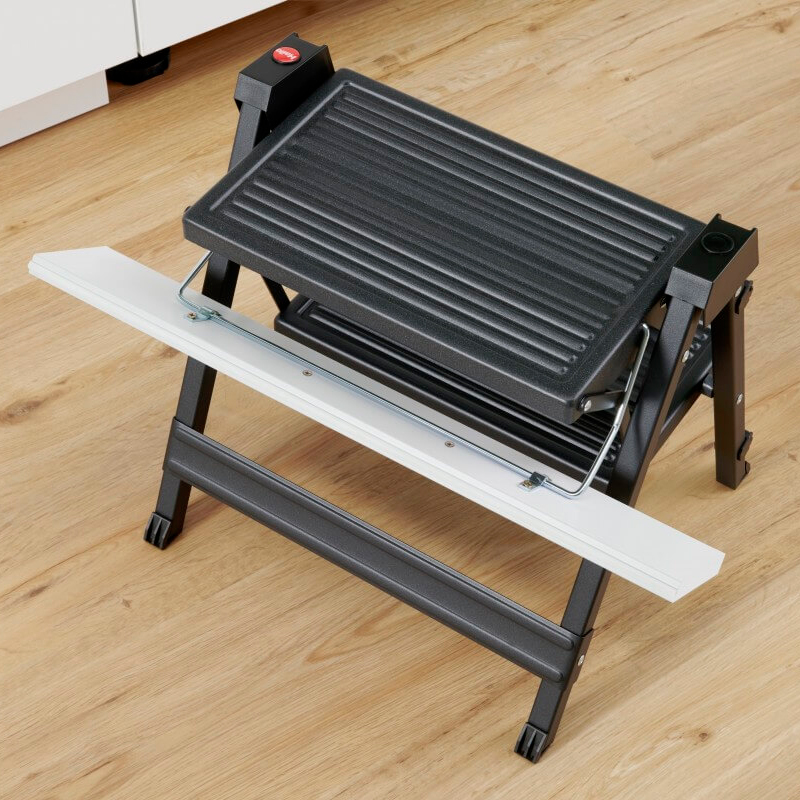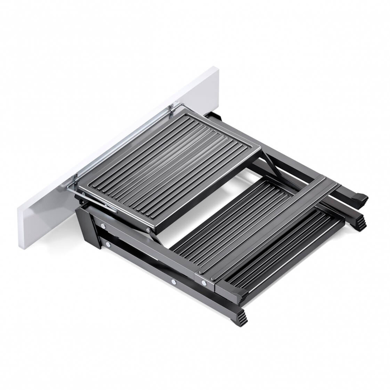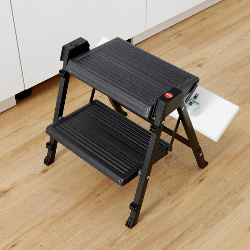 Kätevä 2-askelmainen kokoon taitettava porrasjakkara. Sopii pieneen tilaan. Väri tumman harmaa, kantavuus 150 kg. Lisävarusteena pidike, jolla jakkara voidaan ripustaa kaapin seinään ja etukiinnittimet sokkelin sisään asentamista varten.